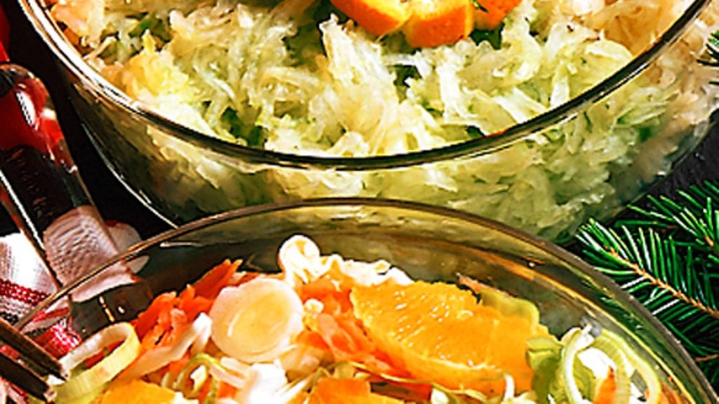 1. Appelsiini-kaalisalaatti: Sekoita vihannekset kulhossa. Kaada päälle puristettua appelsiinimehua.