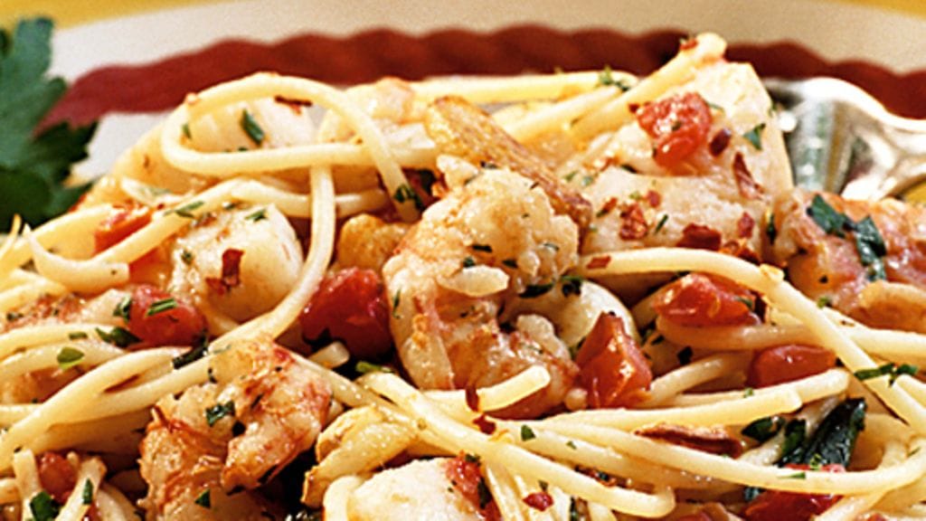 3. Kääntele varoen kalat ja katkaravut ensin tomaattikastikkeeseen, kääntele sitten kastike valmiiseen pastaan. Ripottele päälle hienonnettua persiljaa, tarjoile heti.