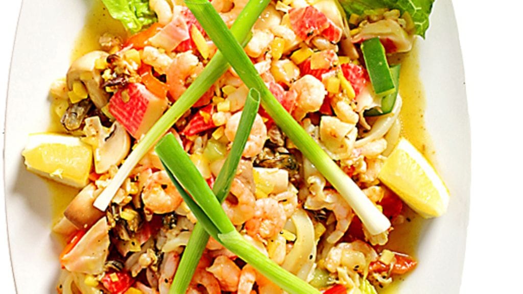 1. Purista appelsiinista mehu, sekoita valkoviinin kera ja purista mukaan valkosipuli. Laita katkaravut, mustekalarenkaat, simpukat ja surimit marinadiin ja anna maustua 1 tunti. Sitronetti: Sekoita öljy ja sitruunamehu, mausta suolalla ja pippurilla. Lohko herkkusienet, laita ne sitronettiliemeen ja marinoi 1 tunti.