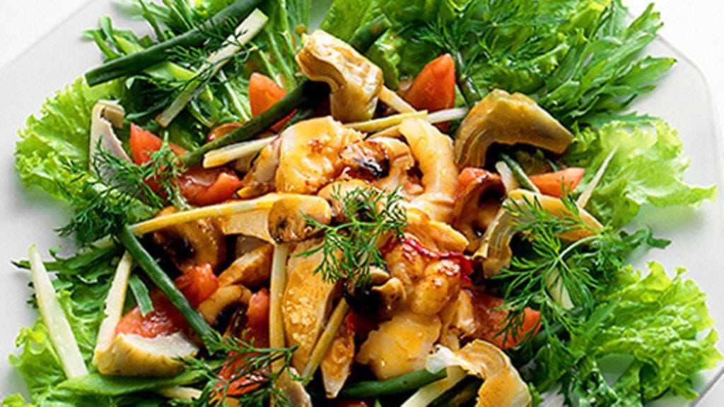 2. Pohjusta kaunis salaattivati salaatinlehdillä. Kerrostele niiden päälle vuorotellen kalaa, artisokanpohja, paprika ja sipulisuikaleita sekä oliiveja. Koristele tillillä.