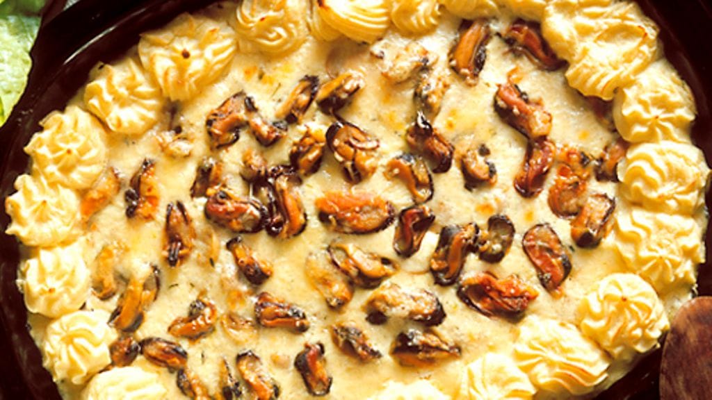 3. Paista sieniä voissa, kunnes ne hieman ruskistuvat. Ripota päälle jauho ja kaada joukkoon liemi ja kerma. Mausta ja keitä 5 minuuttia. Ota liedeltä ja sekoita joukkoon munankeltuainen. Levitä kastike kalan ylle ja laita päälle valutetut simpukat. Gratinoi kuumassa uunissa, kunnes ruoka on kauniisti ruskettunut.