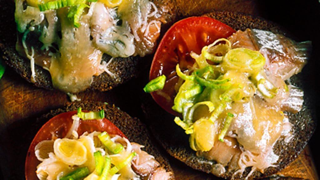 1. Kuumenna uuni 200 asteeseen. Laita jokaiselle leipäviipaleelle viipaloitua tomaattia, 4-5 sillipalaa, purjoa ja juustoraastetta. Gratinoi uunissa kunnes voi on sulanut.