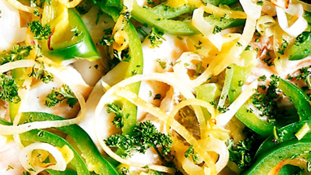 2. Viipaloi sipulit, laita sipuli ja paprika kalan päälle, ripottele päälle persiljaa.