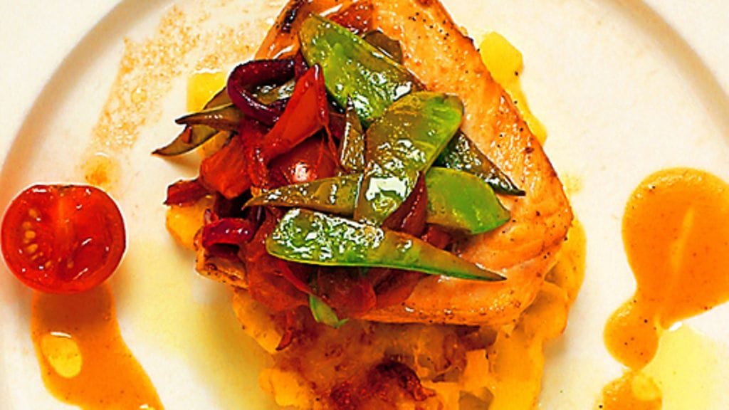2. Kastike: Halkaise yksi punainen ja puolikas keltainen paprika ja poista siemenet. Soseuta paprikat ja salottisipuli, lisää kerma ja kuumenna kiehuvaksi. Kaada joukkoon kalaliemi ja keitä hetki. Siivilöi kastike ja keitä, kunnes koostumus on sopivan sakea. Sekoita Maizena vesitilkkaan ja suurusta kastike.