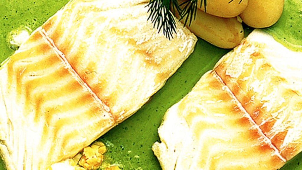 3. Aseta kalafileet lämmitetylle tarjoiluastialle nahkapuoli ylöspäin ja pois nahka. Tarjoile kastikkeen, kanamunahakkeluksen ja keitettyjen perunoiden kera.