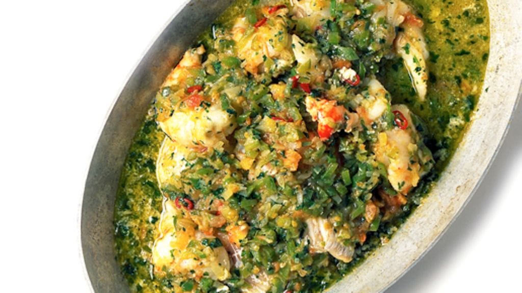 3. Mausta kala ja scampit ja pane ne uunivuokaan. Kaada päälle vihanneskastike ja kypsennä uunin alaosassa 15-20 minuuttia.