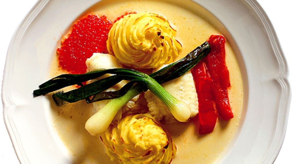 3. Leikkaa koristeluun tarkoitettu purjo renkaiksi tai puhdista istukassipulit. Keitä suolalla maustetussa vedessä. Suikaloi paprika. Lusikoi viinikastiketta neljälle lämpimälle lautaselle. Asettele kalafileet, kirjolohen mäti, purjorenkaat tai sipulit ja paprikasuikaleet lautasille. Tarjoa heti.