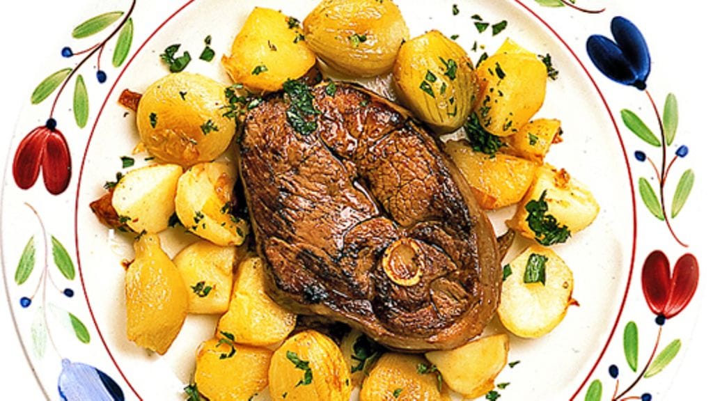 3. Paista lammasviipaleita pannulla muutamassa erässä pari minuuttia kummaltakin puolelta. Mausta suolalla ja pippurilla. Siirrä sivuun. Noin 15 minuutin kuluttua siitä, kun laitoit vihannekset uuniin, lisää pikkusipulit niiden päälle. Toisen vartin kuluttua on lammasviipaleiden vuoro päästä uuniin. Kolmannen vartin päästä koko ateria on valmis!