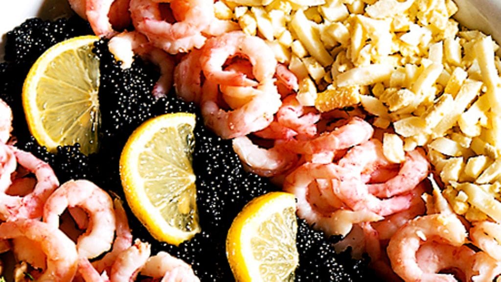 2. Kuori katkaravut. Asettele katkaravut, mäti, valutetut herkkusienet ja munahake kauniisti vadille, koristele sitruunasiivuilla.