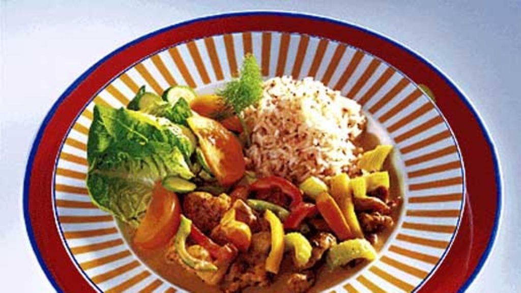 Kiehauta mausteet ja murskattu valkosipulinkynsi öljyssä. Lisää kalkkunasuikaleet ruskistumaan mausteiden joukkoon. Siirrä suikaleet kypsennysastiaan. Lisää paprikapalat, fenkolisuikaleet, selleriviipaleet, vesi, liemikuutio ja siirappi. Hauduta kypsäksi.