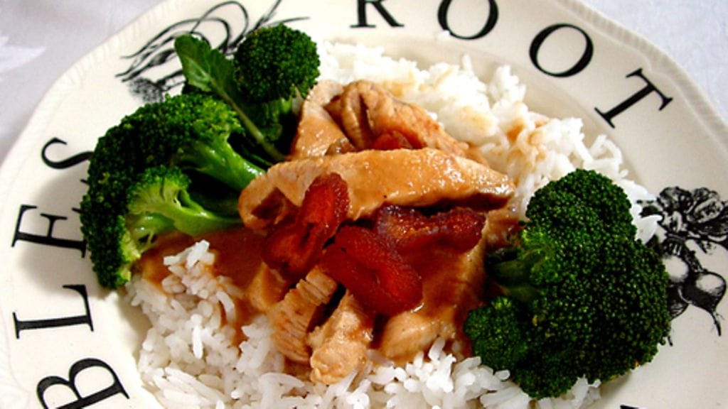 3. Kuumenna kiehuvaksi ja sekoita kunnolla. Lisää aprikoosit, tarjoile riisin ja parsakaalin kera.
