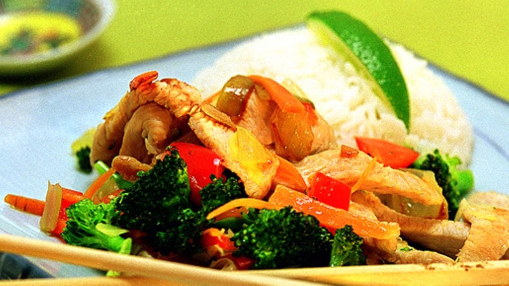 3. Wokkaa kalkkunasuikaleet vähän kerrallaan. Et tarvitse ylimääräistä öljyä wokkaukseen. Pidä liha lämpimänä samalla kun wokkaat vihannekset tilkassa öljyä. Lisää kalkkuna ja anna kaiken lämmetä läpikotaisin. Tarjoile keitetyn jasmiiniriisin kera.