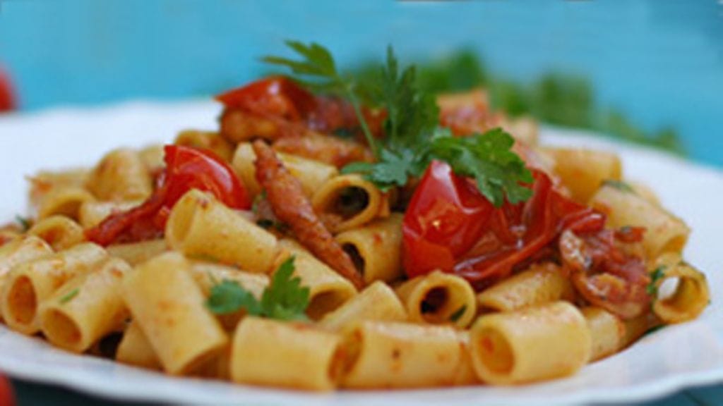 - Keitä pasta samaan aikaan kiehuvassa, suolatussa vedessä 8 minuutin ajan al dente -tilaan asti. Huuhdo ja säästä vähän keitinvettä.