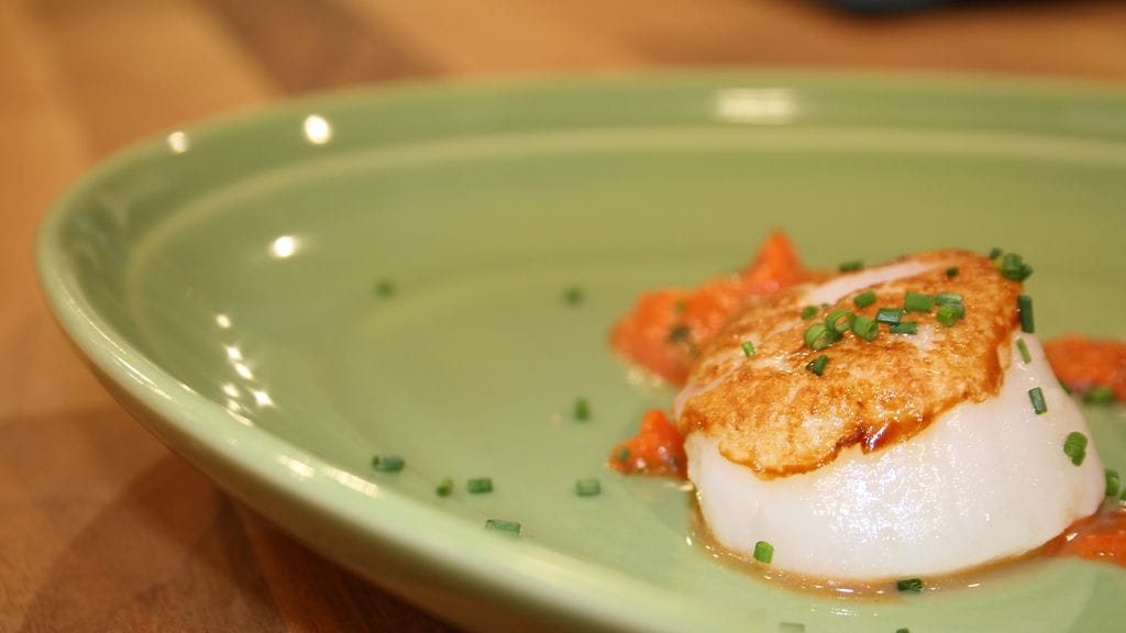 Kuivaa kampasimpukat talouspaperilla kuiviksi; mausta molemmin puolin pippurilla ja suolalla. Paista kampasimpukat pinnoitetulla kuumalla pannulla kirkastetussa voissa molemmin puolin pähkinäisen rapeaksi. Älä paista kypsäksi, että simpukat eivät sitkisty.