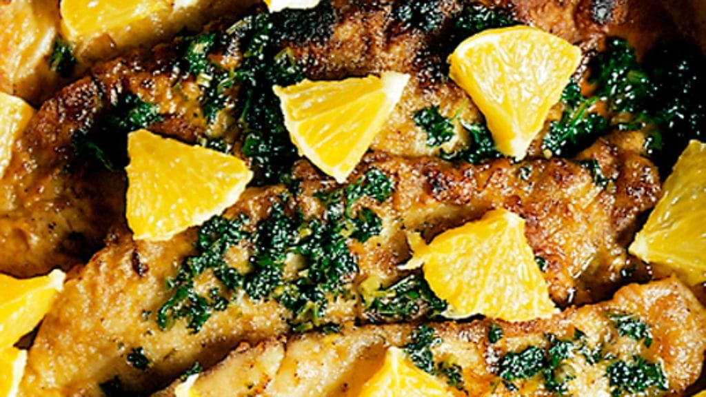 3. Siirrä kalat tarjoiluvadille. Vatkaa paistinpannu yhdistetyillä appelsiini- ja sitruunamehulla, keitä kokoon ja siivilöi liemi kalojen päälle. Koristele voissa freesattu appelsiini-persiljaseos.