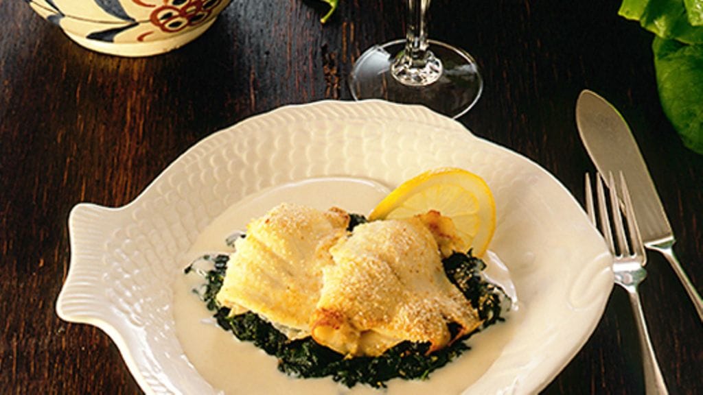 3. Aseta fileet pinaattipedille ja kaada fondi päälle. Tipauta pinnalle muutama voinokare. Peitä foliolla ja laita uuniin 15-20 minuutiksi, kunnes kala on melkein kypsää. Ripottele pinnalle parmesaaniraastetta ja anna ruoan saada vielä väriä uunissa ilman foliota.