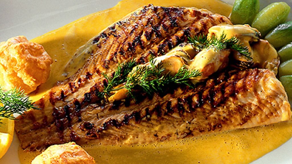 3. Laita ½ dl kastiketta pieneen kattilaan, kuumenna simpukat siinä. Asettele simpukat kalafileille. Koristele tillillä ja tarjoile heti lopun kastikkeen kera.