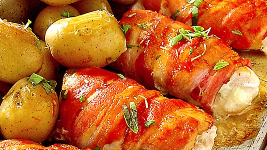1. Kuumenna uuni 200 asteeseen. Nuiji kanafileet voipaperin alla noin kaksinkertaisiksi. Leikkaa juusto tangoiksi. Laita jokaisen fileen keskelle juustotanko, mausta suolalla ja pippurilla ja kääri rullalle. Kääri pekonisiivut tiukasti kanarullien ympärille.