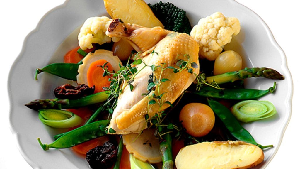 3. Huuhdo vihreät pavut ja sokeriherneet ja poista niistä kovat kannat. Leikkaa korvasienet pieneksi. Lisää ne keittämisen loppupuolella. Nosta kanapalat ja vihannekset liemestä reikäkauhalla. Jaa vihannekset lämpimille syville lautasille ja aseta leikkeet niiden päälle. Kaada lautasille lientä ja koristele timjamilla.