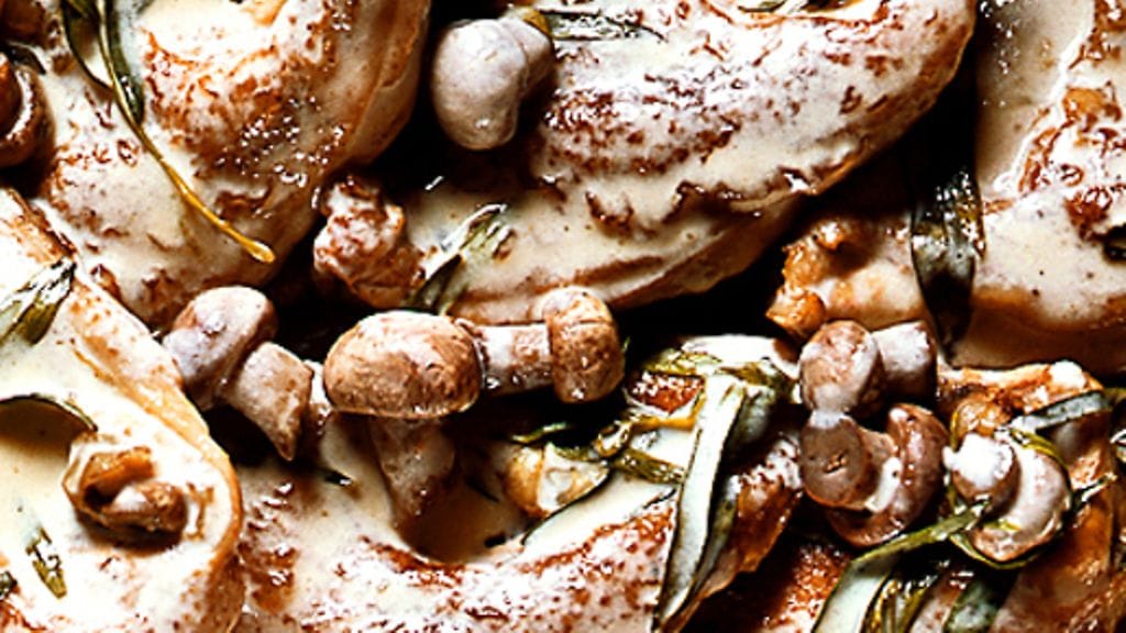 2. Keitä sillä aikaa kerma kokoon paksupohjaisessa kattilassa ilman kantta, kunnes jäljellä on puolet. Nosta kana ja sienet padasta ja laita tarjoiluvadille. Keitä kokoon liemi kunnes jäljellä on puolet, ja sekoita kerman kanssa. Mausta ja kaada kastike kanoille. Tarjoile riisin ja salaatin kera.