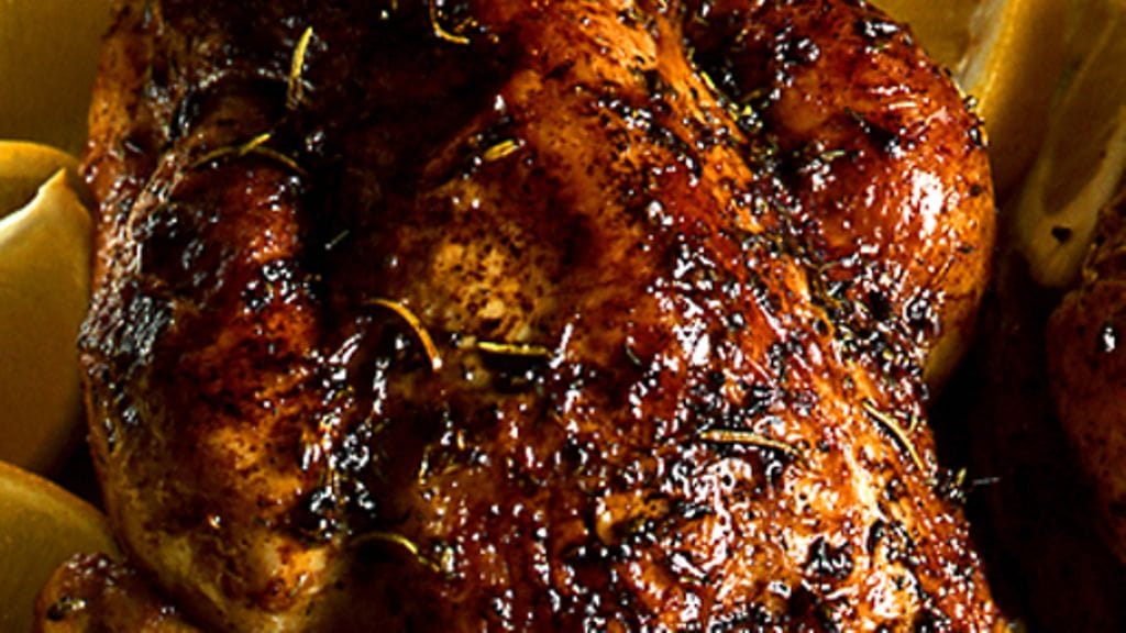 2. Ota esiin uuninkestävä vuoka, johon molemmat broilerit mahtuvat. Mausta broilerit sisältä ja täytä ne parilla sitruunalohkolla ja persiljanoksalla. Sido broilerit kiinni. Pirskota niiden päälle hieman sitruunamehua, mausta suolalla, pippurilla ja paprikalla ja laita ne vuokaan. Sekoita öljy ja soija ja penslaa broilerit seoksella. Ripottele viimeiseksi päälle rosmariinia ja timjamia.