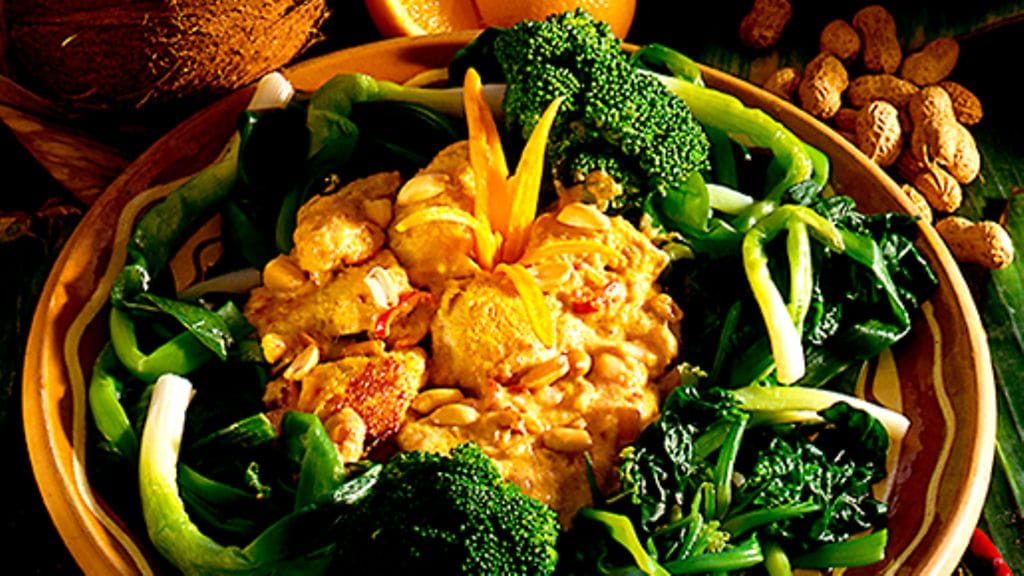 3. Leikkaa fileet isohkoiksi kuutioiksi. Laita ne maapähkinäkastikkeeseen vähän kerrallaan ja anna kiehahtaa aina erien välillä. Anna lopuksi fileepalojen kiehua hiljaa kastikkeessa 10 minuuttia. Tarjoile vihannesten kanssa.
