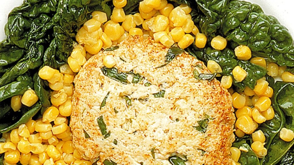 3. Muotoile jauhelihasta pihvejä ja paista ne molemmilta puolilta voissa kauniin ruskeiksi ja läpikypsiksi. Silppua ruohosipuli hienoksi ja sekoita kastikkeeseen juuri ennen tarjoilua. Aseta pinaatinlehdet ja maissinjyvät lämpimille lautasille ja nosta pihvit niiden päälle. Tarjoile kastike erillään.