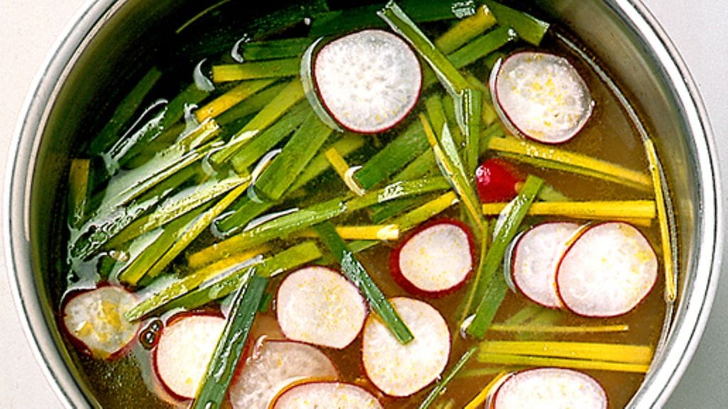 2. Kuumenna vesi kiehuvaksi liemikuutioiden kanssa. Pane peruna- ja porkkanasuikaleet kiehumaan 5 minuutiksi. Lisää purjo ja kananliha ja keitä vielä 5 minuuttia. Lisää retiisisiivut juuri ennen tarjoilua.