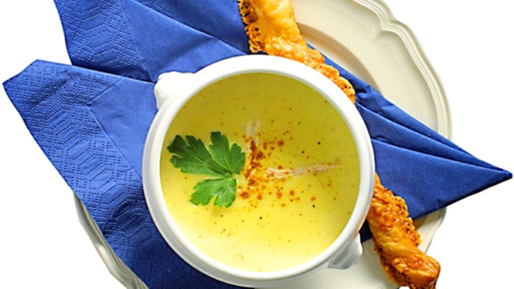 3. Lisää joukkoon kerma ja kiehauta. Mausta suolalla, pippurilla ja muskotilla. Siivilöi. Lisää sitten joukkoon kananliha. Kiehauta. Ripottele pinnalle currya ja tarjoile keitto kiehuvan kuumana keittokulhossa.