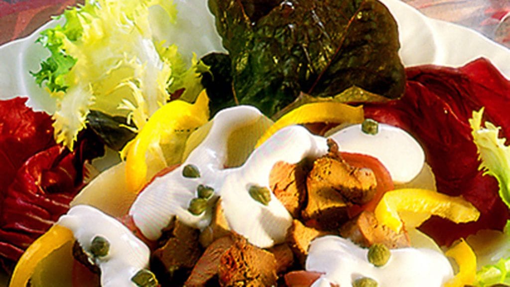 3. Puhdista ja huuhtele salaatinlehdet, revi ne pienemmiksi ja laita salaattikulhoon. Suikaloi paprika ja lisää kulhoon, päällimmäiseksi asettelet maksaa ja pekonia. Tarjoile kastikkeen kera.