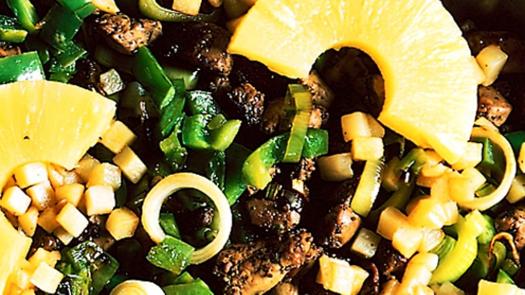 3. Paista viimeiseksi purjo ja paprika ja sekoita edellisiin. Laita muutama ananasrengas päällimmäiseksi ja tarjoile.