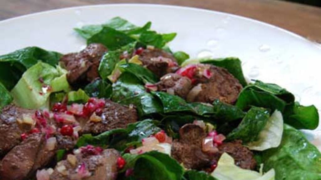 Poista pinaatinlehdistä kanta ja kova ruotiosa. Annostele pinaatinlehdet ja muutama revitty jääsalaatinlehti neljälle lautaselle. Kuullota sipuli pannussa. Yhdistä pienessä kattilassa öljy, etikka, sokeri, kuullotettu sipuli, puolukat, suola ja pippuri. Lämmitä vinegretti haaleaksi ja lisää punasipuli juuri ennen tarjoilua. Kuumenna öljyä ja voita pannulla ja paista maksasiivuja minuutti per puoli. Mausta suolalla ja pippurilla. Anna maksan vetäytyä hetki. Nosta maksasiivut salaattipetien päälle ja lusikoi pinnalle vinegrettiä.