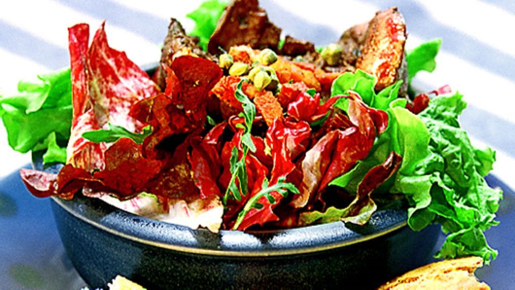 3. Asettele salaatinlehtiä neljään kulhoon. Täytä kulhot kananmaksalla, kapriksilla ja pekonilla. Tiputtele päälle öljyä ja viinietikkaa, jauha mielellään päälle hieman mustapippuria myllystä ja ripottele päälle hiutalesuolaa. Tarjoile leivän ja tomaatin kanssa.