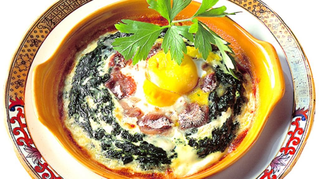 2. Annostele pinaatti annosvuokiin, tee keskelle kuoppa ja valuta siihen kananmuna. Asettele anjovisviipaleet kananmunan ympärille ja kaada päälle ruokalusikallinen kermaa.