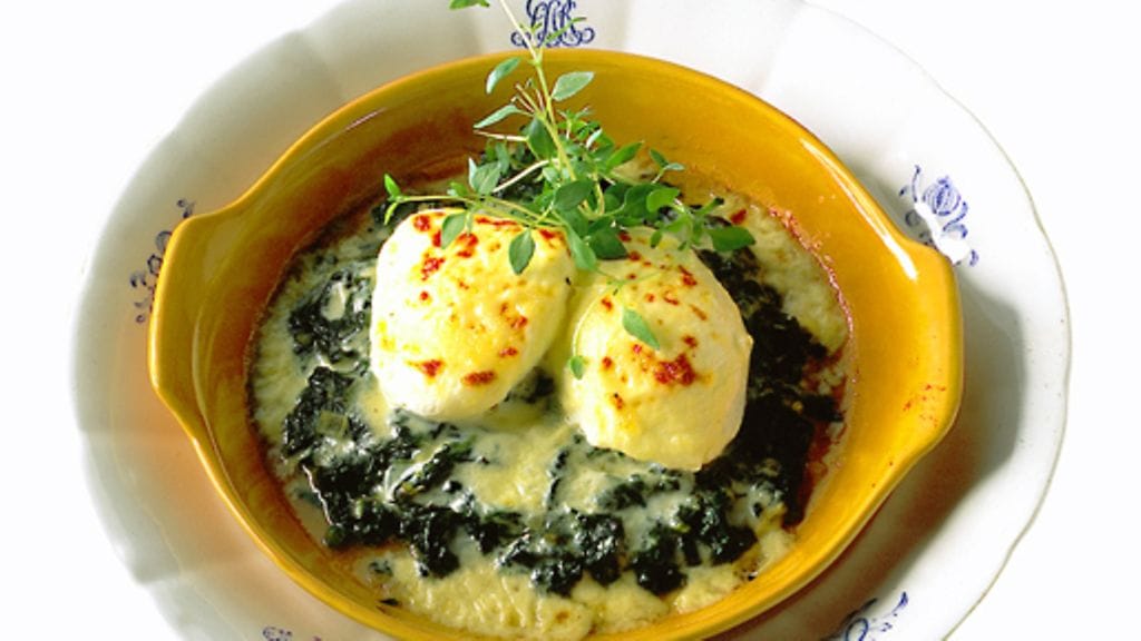1. Kuumenna uuni 275 asteeseen ja napsauta grillivastus päälle. Puhdista ja huuhdo pinaatti. Paista hienonnettu sipuli voinokareessa. Ryöppää pinaatti runsaassa, kiehuvassa vedessä. Puristele ylimääräinen vesi pinaatista pois ja lisää pinaatti sipulikattilaan. Mausta suolalla, pippurilla ja halutessasi muskotilla.