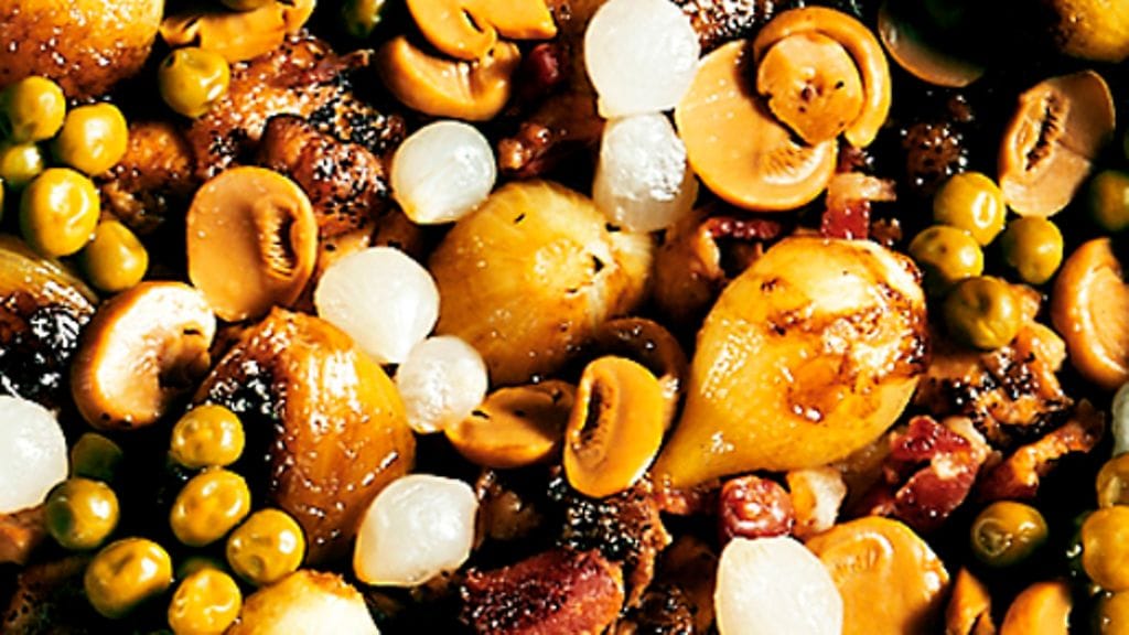 3. Anna padan porista hiljaa kannen alla noin 40 minuuttia. Kääntele joukkoon herneet, hillosipulit ja sienet, kun pata on melkein valmis.