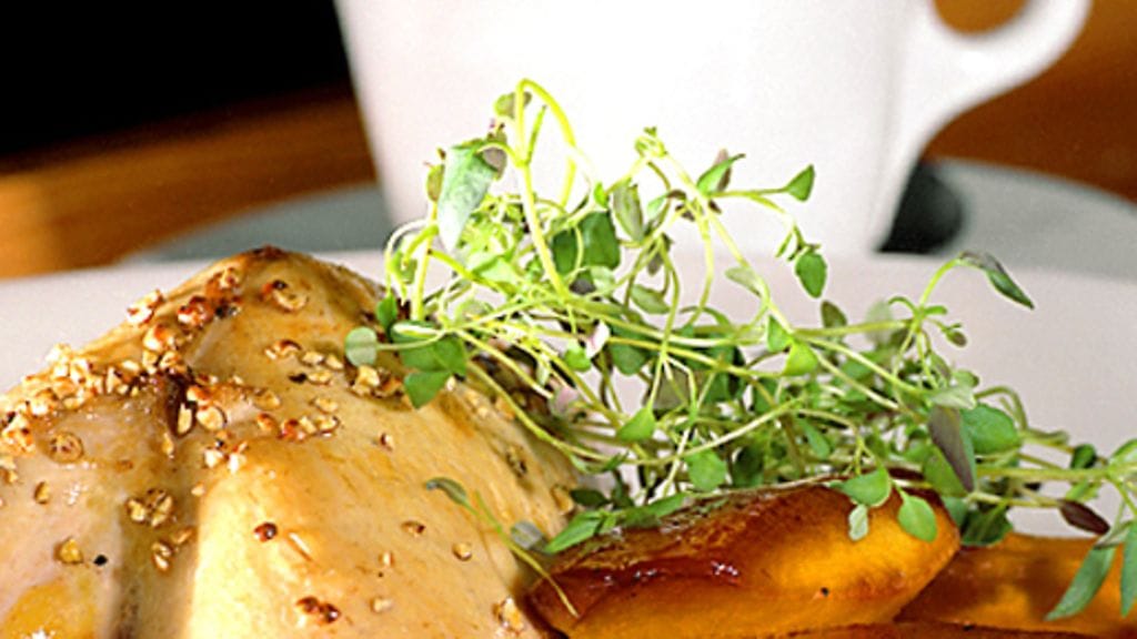 2. Kuumenna uuni 200 asteeseen. Leikkaa kummastakin broilerista irti koko rinta, niin että rintalasta ja kylkiluut tulevat mukaan. Hiero lihaan suolaa ja pippuria molemmille puolille. Ruskista satulat voissa kauttaaltaan ja nosta ne sitten uunivuokaan. Jälkikypsytä uunissa 20 minuuttia.