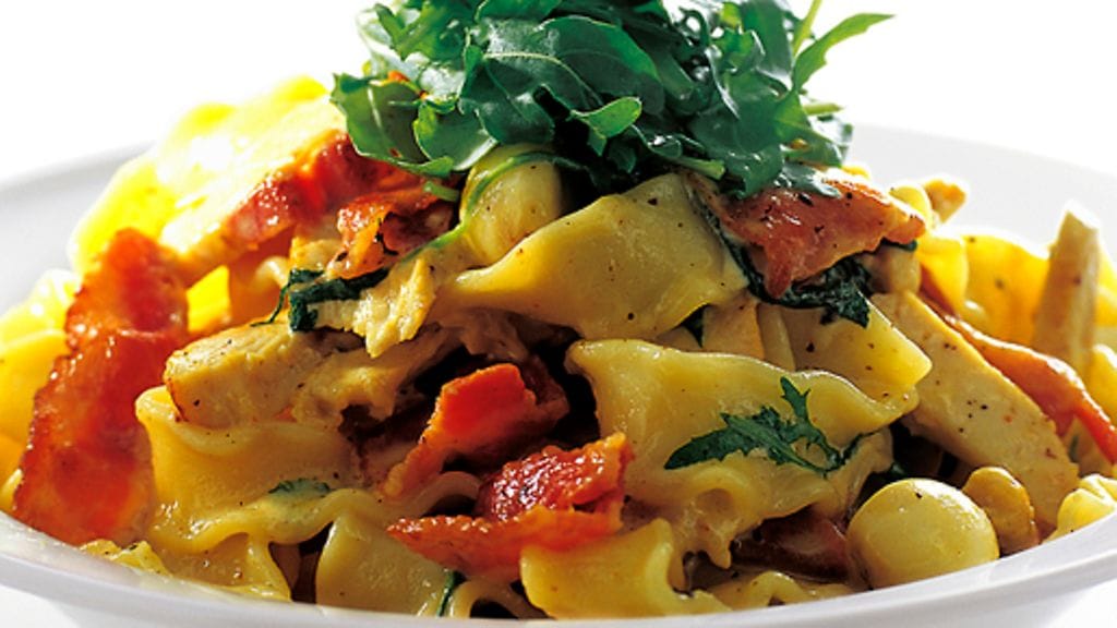 2. Irrota kanan lihat luista ja leikkaa liha pienemmiksi paloiksi. Kuullota kananlihaa ja pekonia valkosipulinkynsien kanssa oliiviöljyssä. Kaada joukkoon kerma ja kanaliemi. Keitä kokoon viisi minuuttia ja mausta sitten paprikajauheella, suolalla ja pippurilla.