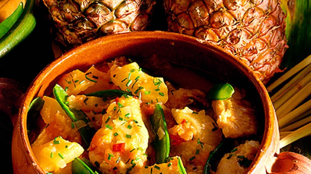 3. Lisää pataan ananaspalat ja ruohosipuli ja kiehauta. Mausta suolalla ja pippurilla, lisää sokeriherneet, jotka tarvitsevat vain puolen minuutin kiehautuksen.