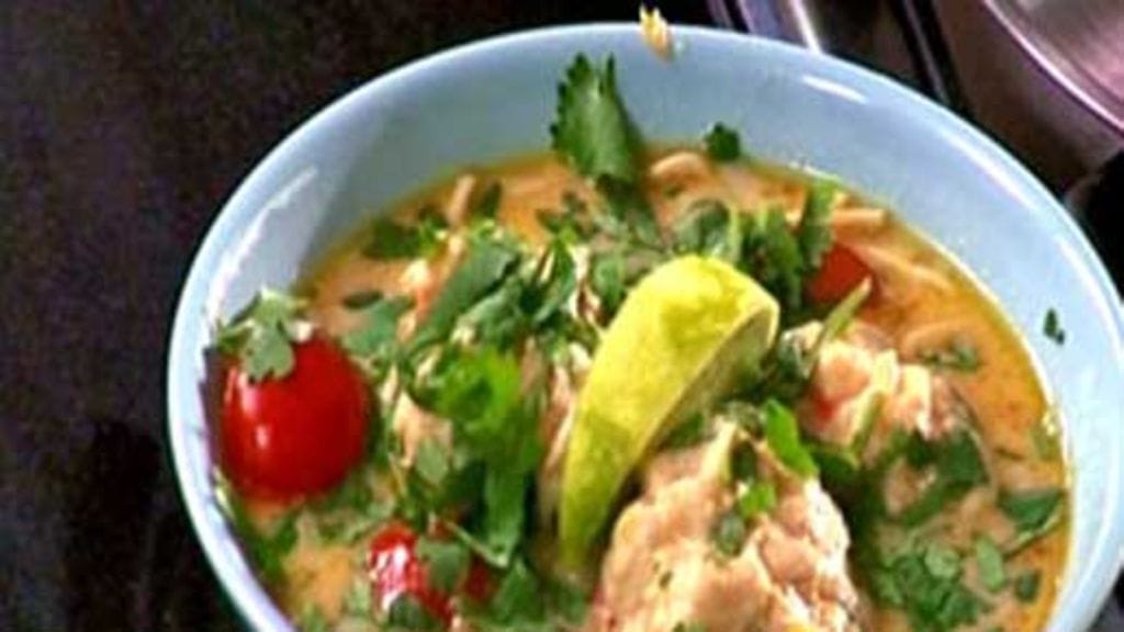 Keitä nuudelit vedessä ja siivilöi. Kuumenna tilkka öljyä kattilassa ja pyörittele siinä inkivääriä ja sitruunaruohoa kunnes ne alkavat tuoksua. Lisää kanaliemi ja kookosmaito, kiehauta. Laske keiton lämpöä niin, että se kiehuu tasaisesti, muuten kanapallot hajoavat.