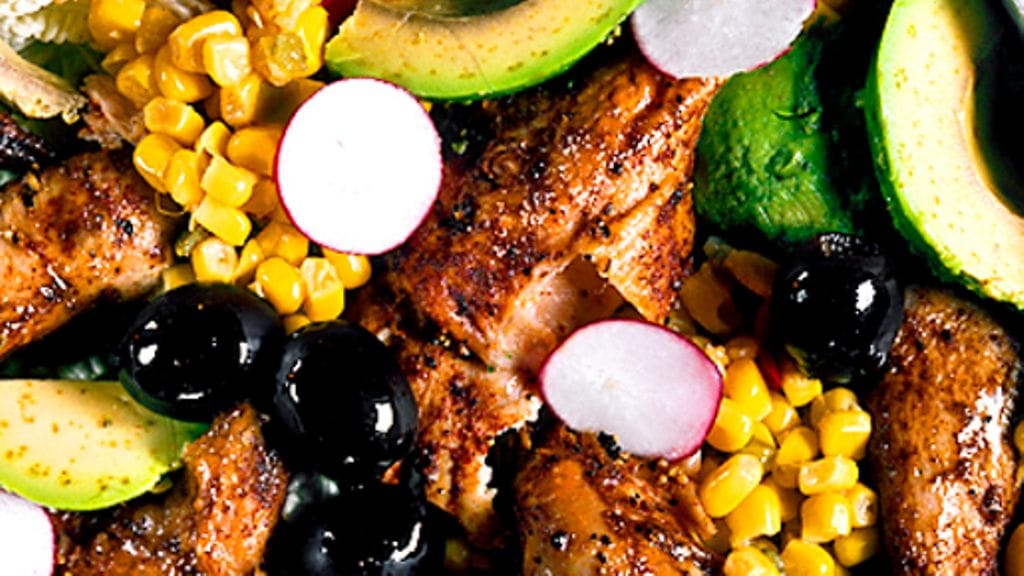 Avokadon, maissin ja oliivien kera tästä tulee ruokaisa kanasalaatti. Kääntele kastike salaattiin juuri ennen tarjoilua.