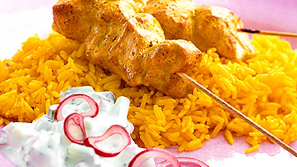 2. Liuota sahrami ruokalusikalliseen vettä. Keitä vesi riisiä varten ja sekoita siihen puolet sahramiseoksesta. Keitä riisi pakkauksen ohjeen mukaan. Leikkaa kurkku tikuiksi. Kuori valkosipulinkynsi. Sekoita jogurtti, kurkku, minttu, suola ja pippuri. Purista valkosipulinkynsi joukkoon ja sekoita. Pane kylmään tarjoiluun asti. Viipaloi punasipuli ja koristele kastike sillä juuri ennen tarjoilua.