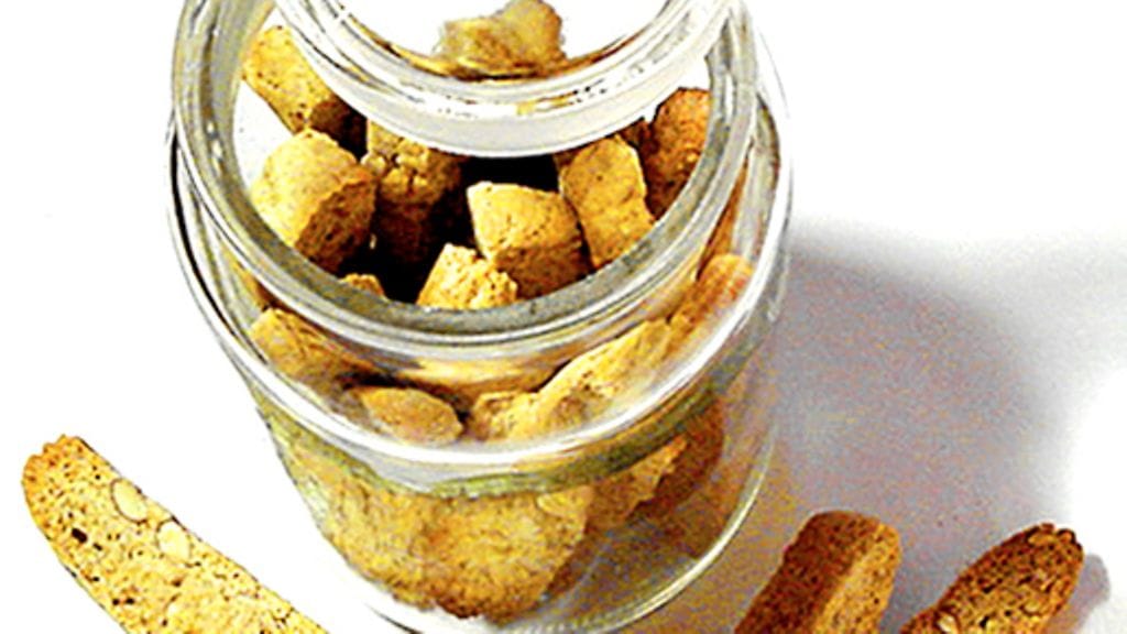 3. Ota uunista ja anna jäähtyä hiukan, leikkaa pitkot sitten n. sentinpaksuisiksi siivuiksi. Laita biscotit uuniritilälle ja paista vielä n. 12 minuuttia. Anna jäähtyä.