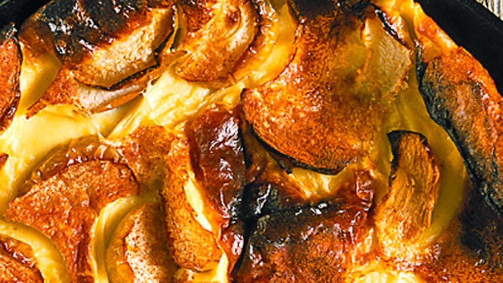 2. Sulata margariini suuressa paistinpannussa ja kaada taikina pannuun. Pistele siihen omenalohkot, puuteroi päälle kanelia.