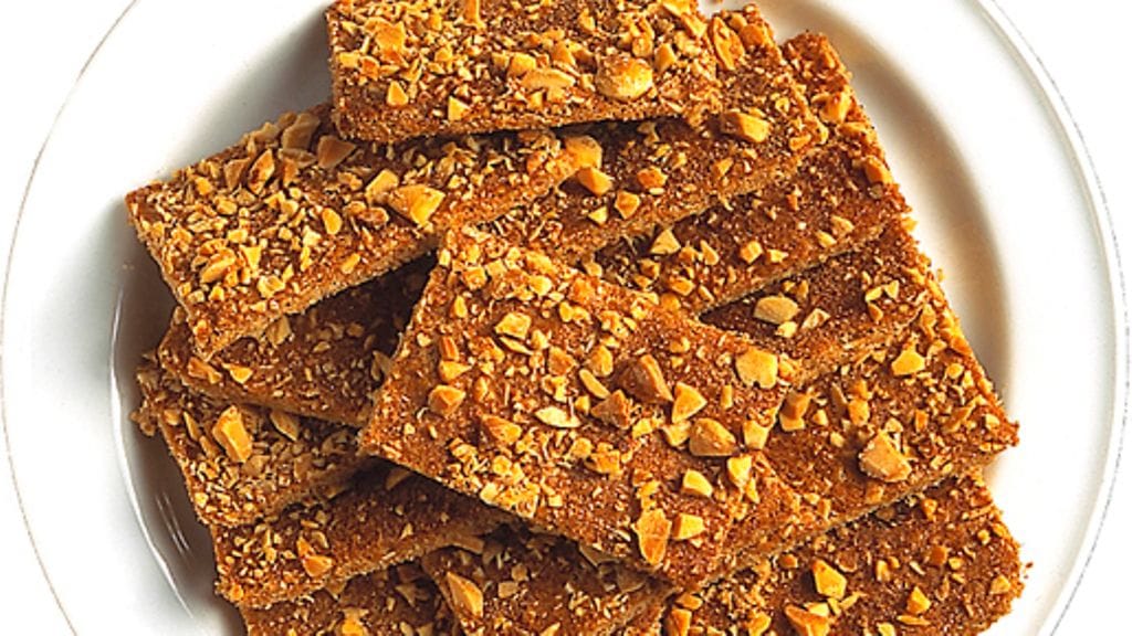 3. Paista taikinalevyä uunissa noin 10 minuuttia, kunnes se on kullanruskea. Leikkaa hieman jäähtynyt levy noin 3 x 6 cm paloiksi ja anna kakkusten jäähtyä ritilän päällä.