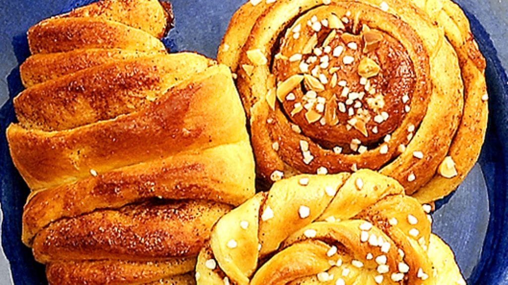 1. Sulata margariini kattilassa. Lisää maito ja lämmitä kädenlämpöiseksi, 37 astetta. Murusta hiiva taikinakulhoon, kaada päälle hieman kädenlämpöistä maitoa ja liuota hiiva. Lisää loput maidosta sekä sokeri, suola ja kardemumma. Sekoita. Lisää jauhot vähän kerrallaan ja sekoita taikina sileäksi ja kiiltäväksi. Peitä ja anna kohota kaksinkertaiseksi, n. 1 tunti. Asettele 60 pientä paperivuokaa kahdelle pellille.