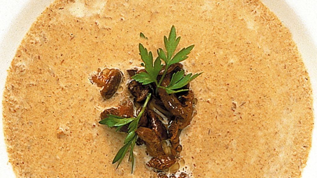1. Perkaa sienet ja kuullota niitä voissa miedolla lämmöllä noin 10 minuuttia. Ota erilleen muutamia pieniä sieniä ja säästä ne koristeiksi. Sirottele jauhot sienille ja sekoita. Kaada puolet kanaliemestä sieni-jauhoseokseen koko ajan hämmentäen.