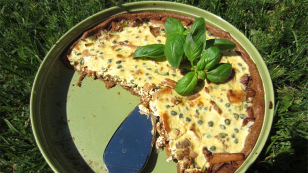 3. Levitä sieni-sipuliseos vuokaan ja kaada päälle kerma-munaliemi. Paista 200-asteisen uunin alimmalla tasolla 30–40 minuuttia.