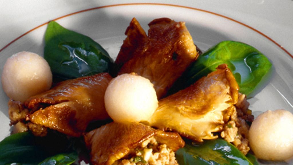3. Asettele kantarellihatut neljälle lautaselle, koristele basilikanlehdillä ja perunapalloilla. Pirskota päälle balsamiviinietikkaa ennen tarjoilua.