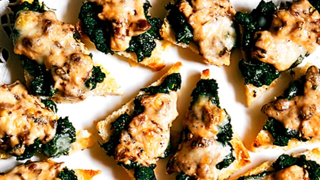 3. Nosta jokaiselle leipäpalalle hiukan pinaattia ja peitä se sienimuhennoksella. Ripottele päälle juustoraaste ja gratinoi uunissa, kunnes juusto on sulanut.
